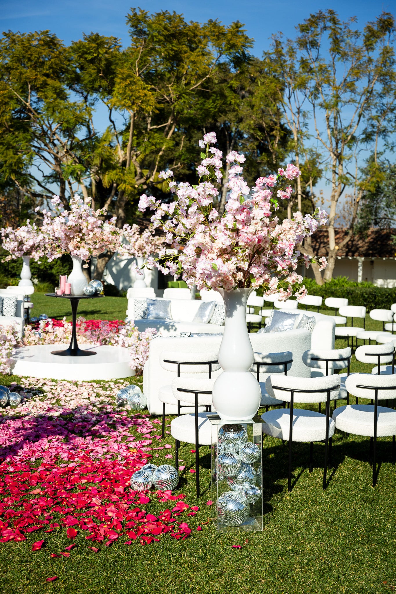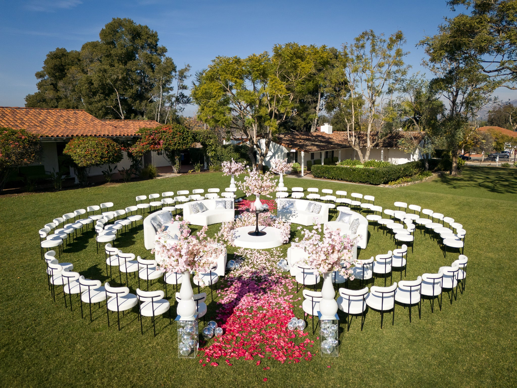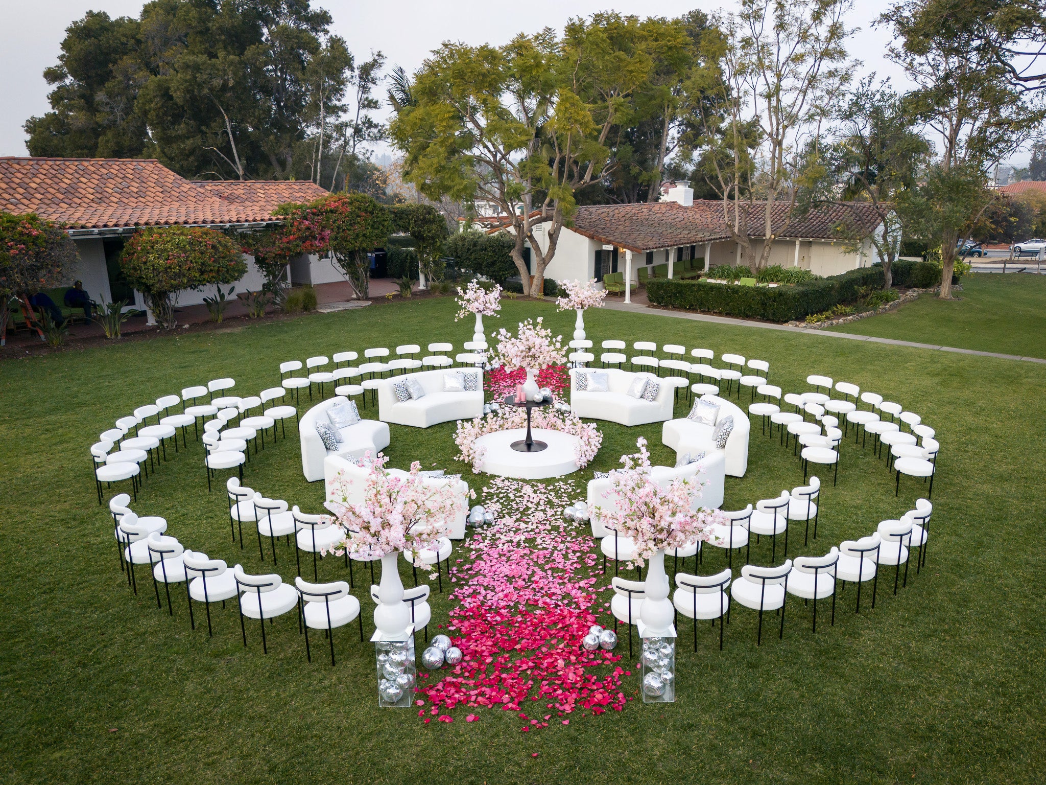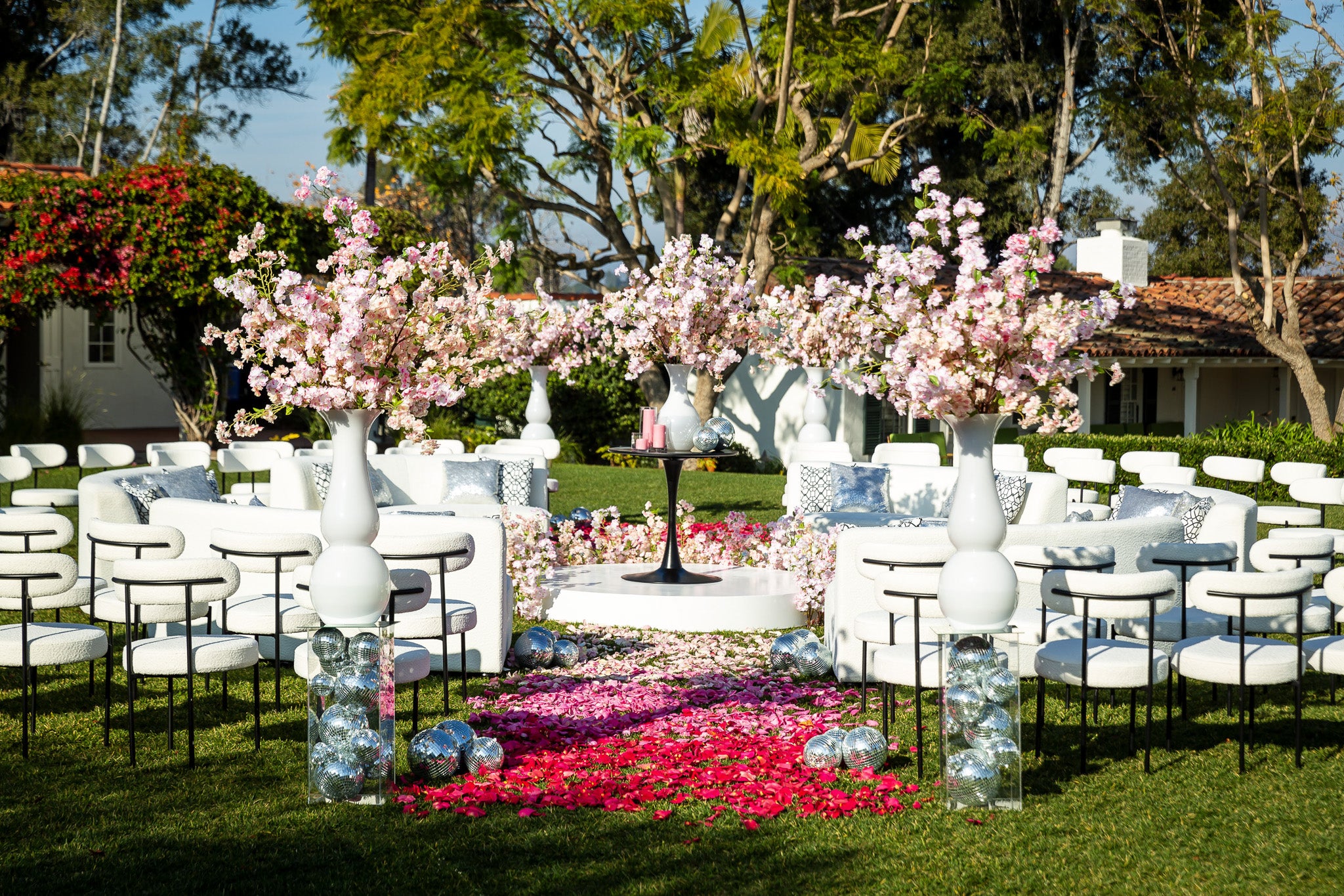The images of the Modern Spring Wedding focus on blooming branches and a cascade of colorful petals lining the aisles. Each image highlights the unique circular arrangement of chairs, converging inwards towards the center, where the wedding ceremony takes place. The petal-strewn aisles, bursting with hues of red, pink, and white, guide the eye to this center floral installation on the alter.