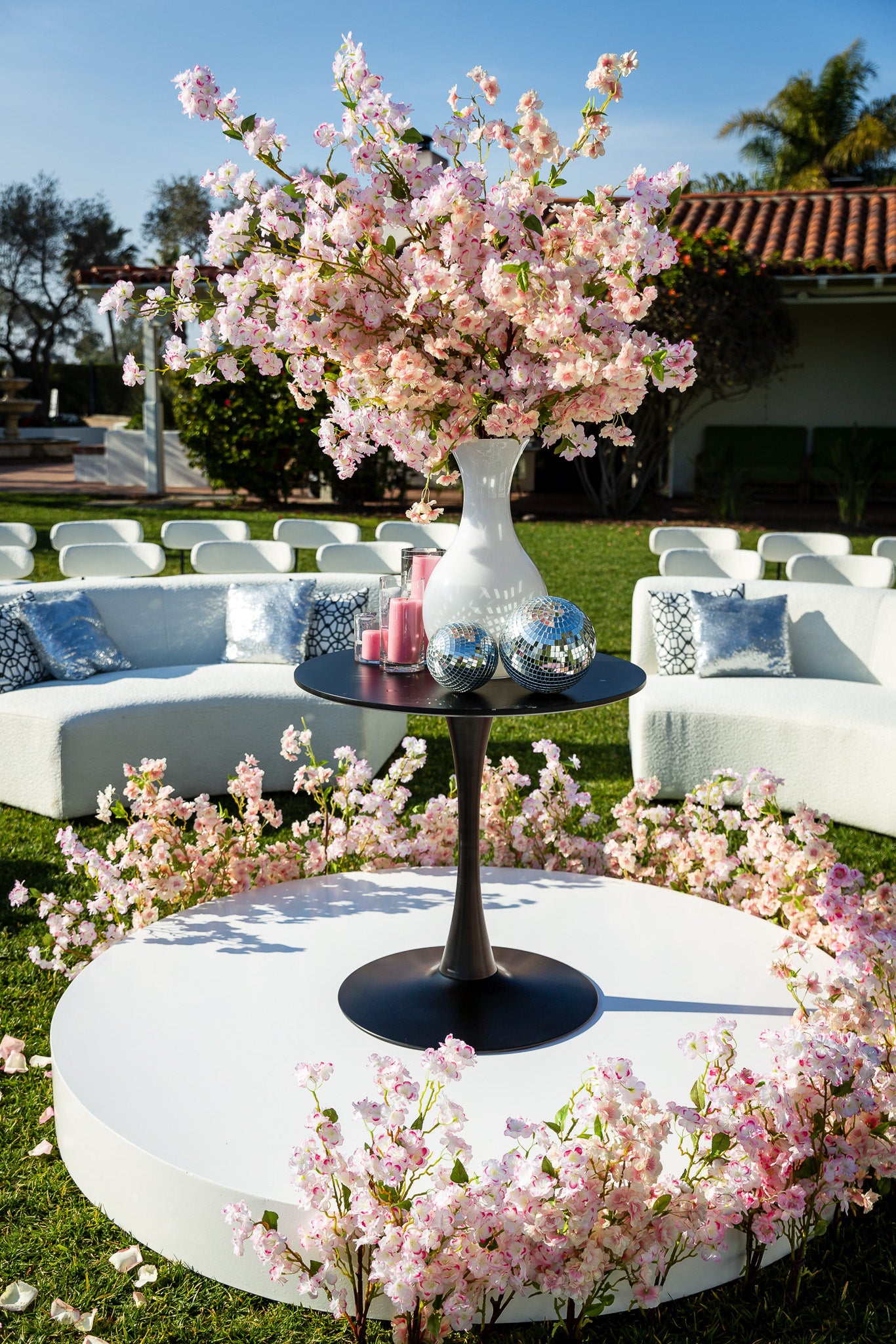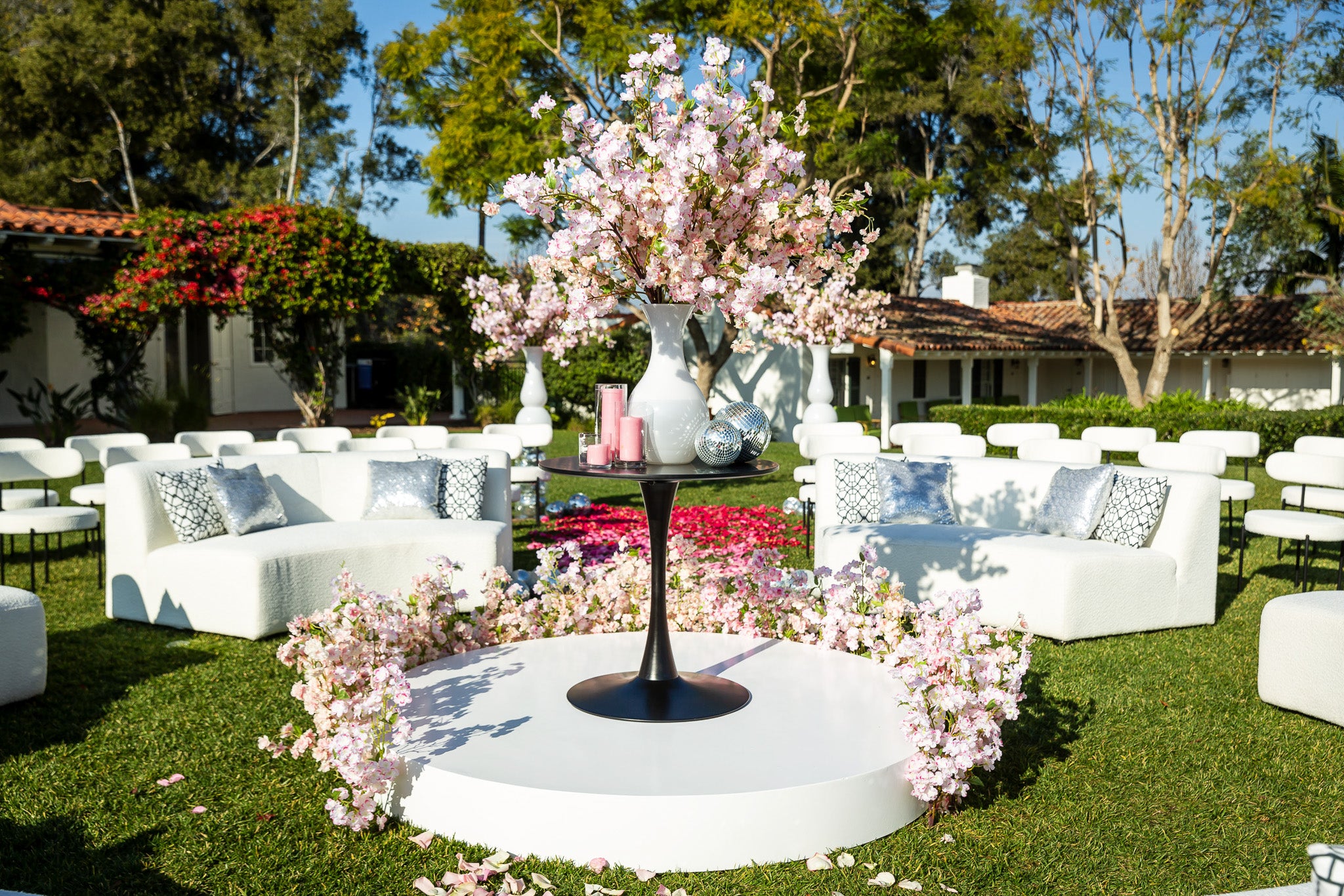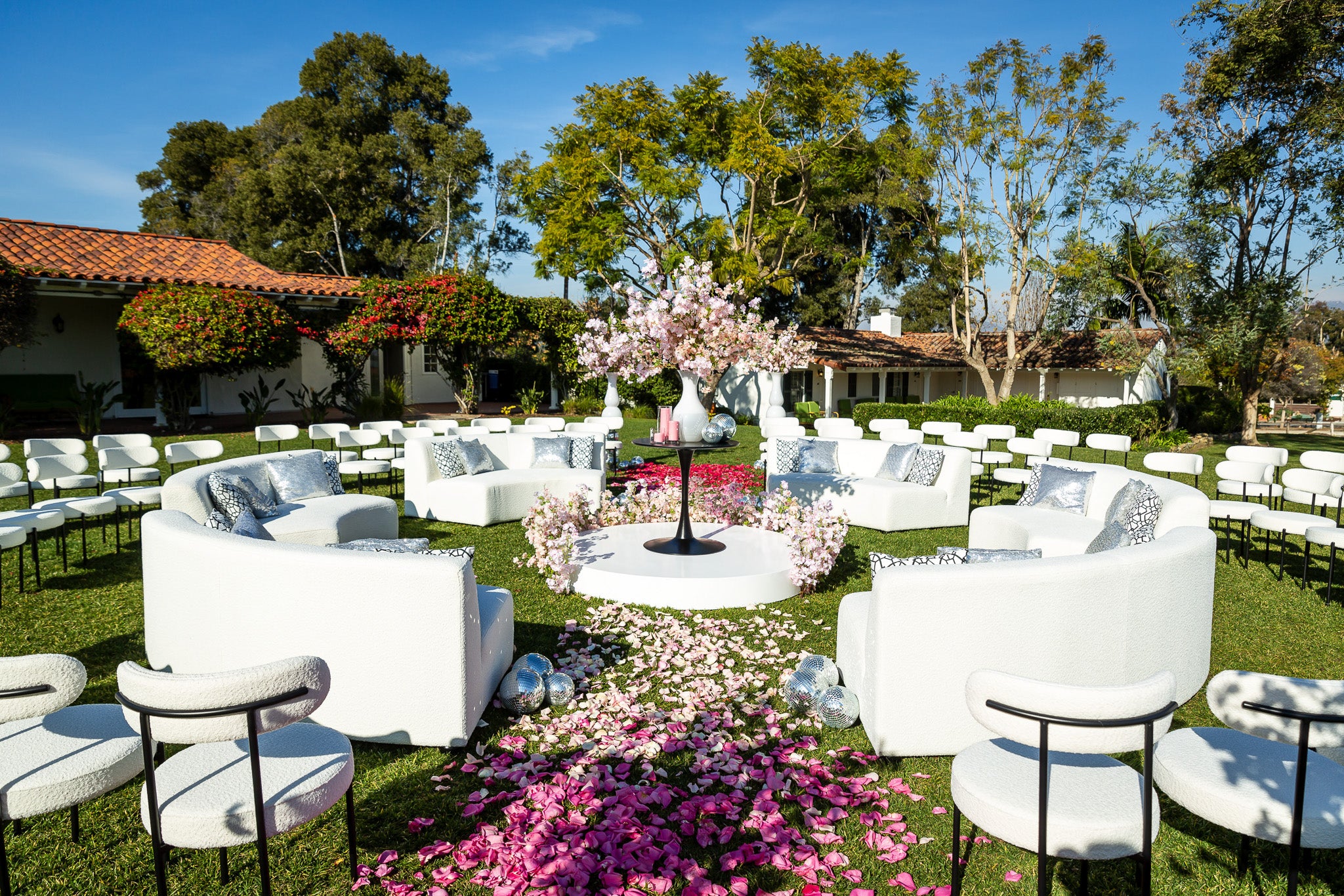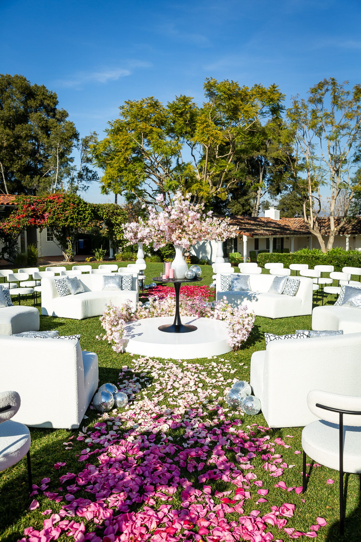 The images of the Modern Spring Wedding focus on blooming branches and a cascade of colorful petals lining the aisles. Each image highlights the unique circular arrangement of chairs, converging inwards towards the center, where the wedding ceremony takes place. The petal-strewn aisles, bursting with hues of red, pink, and white, guide the eye to this center floral installation on the alter.