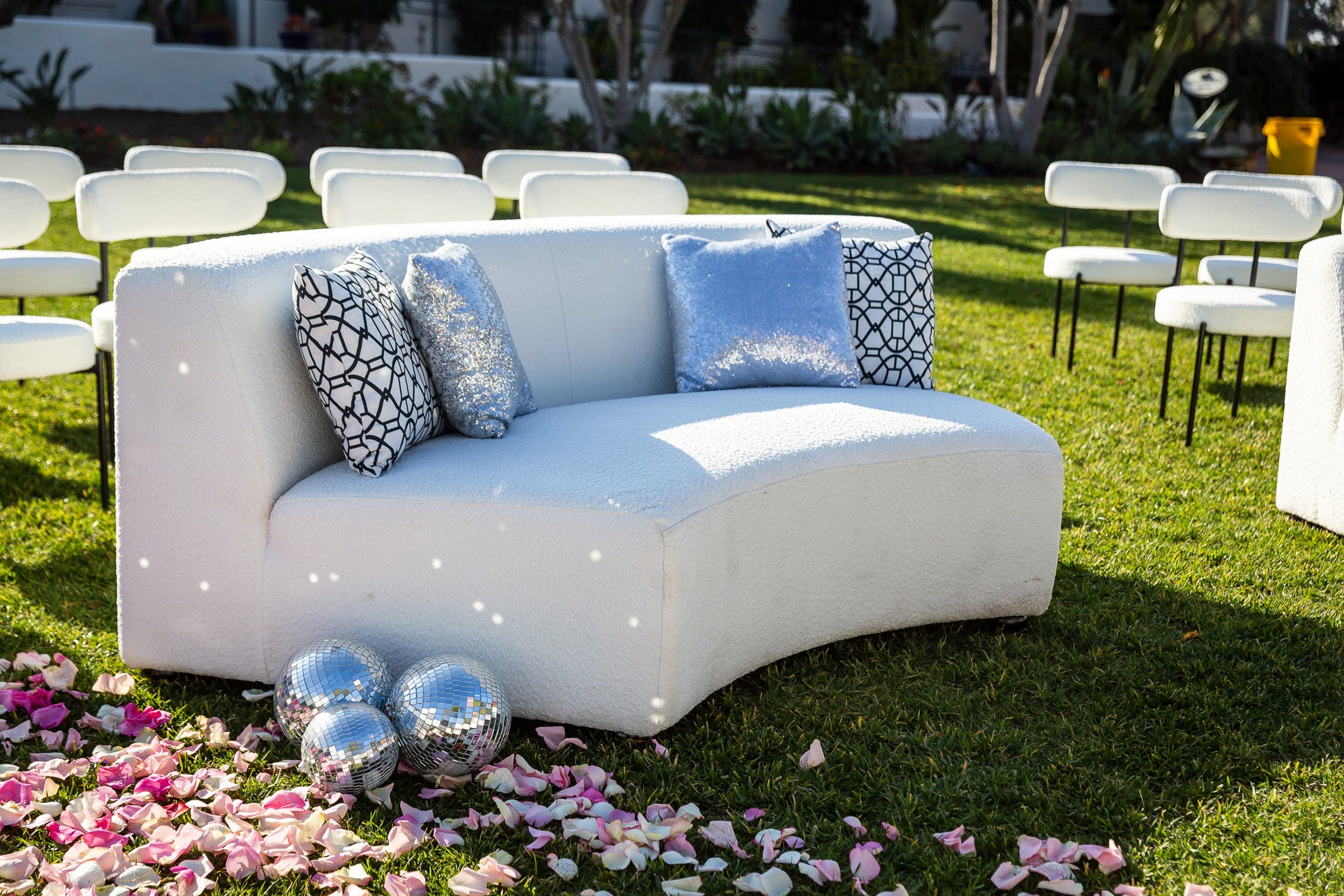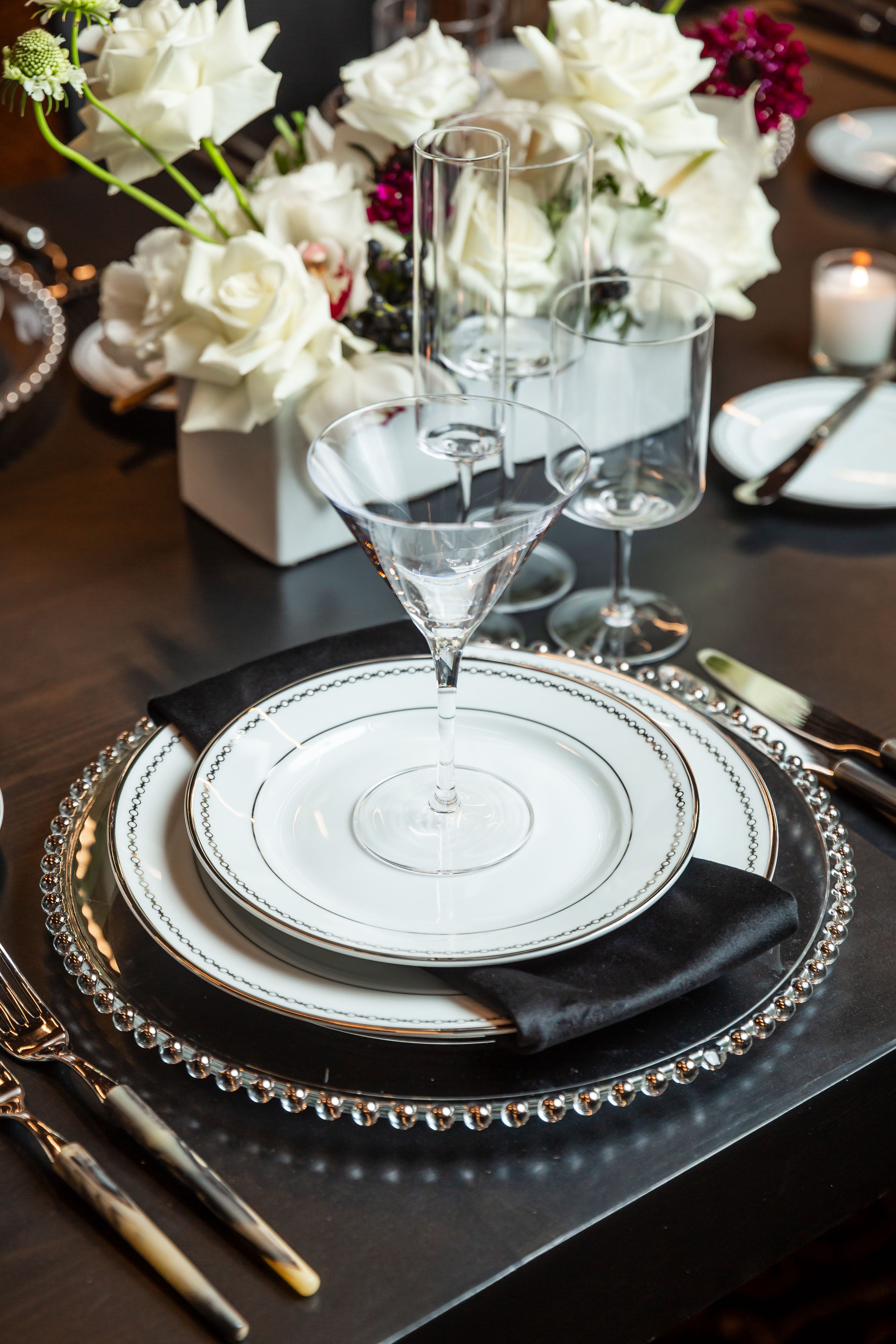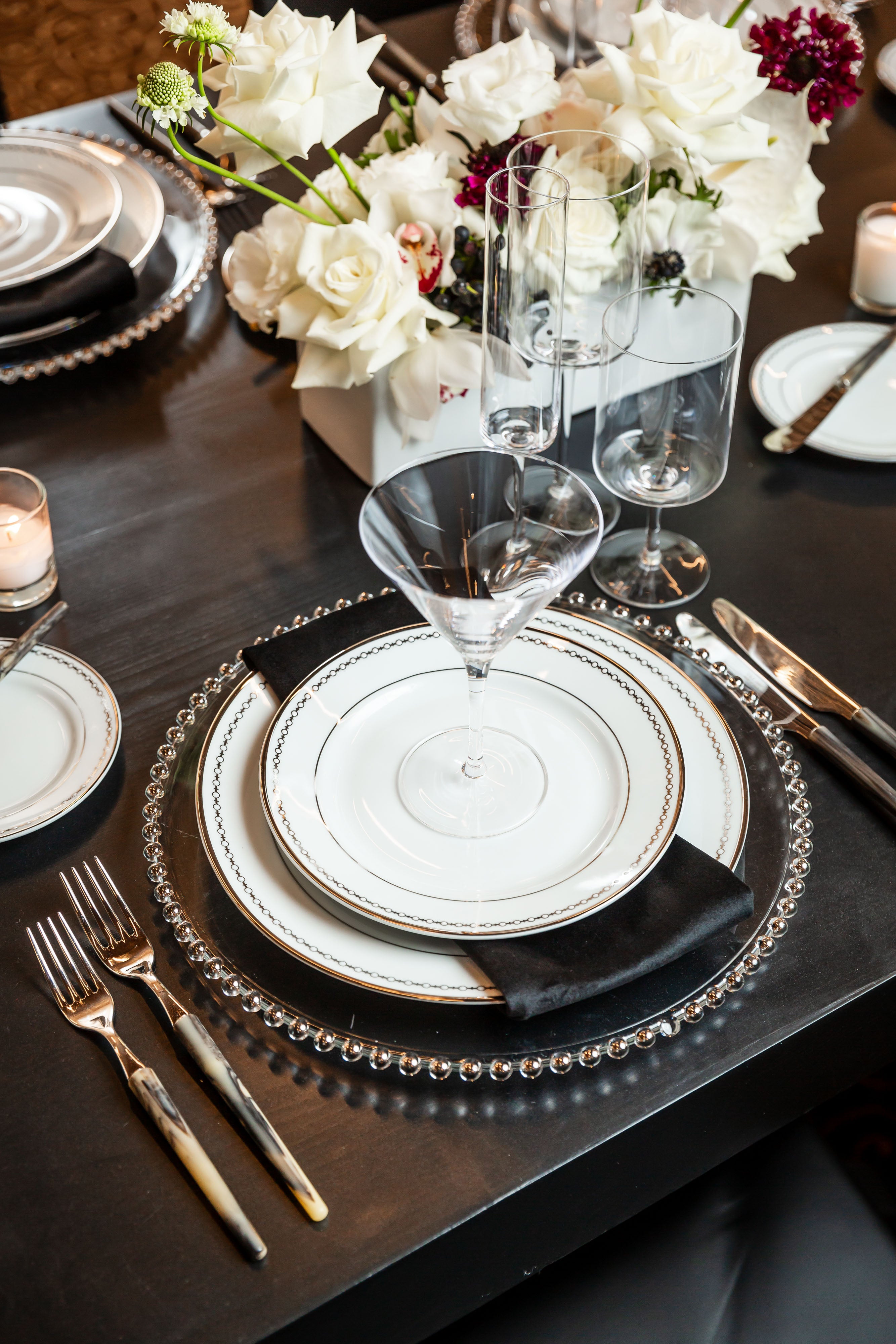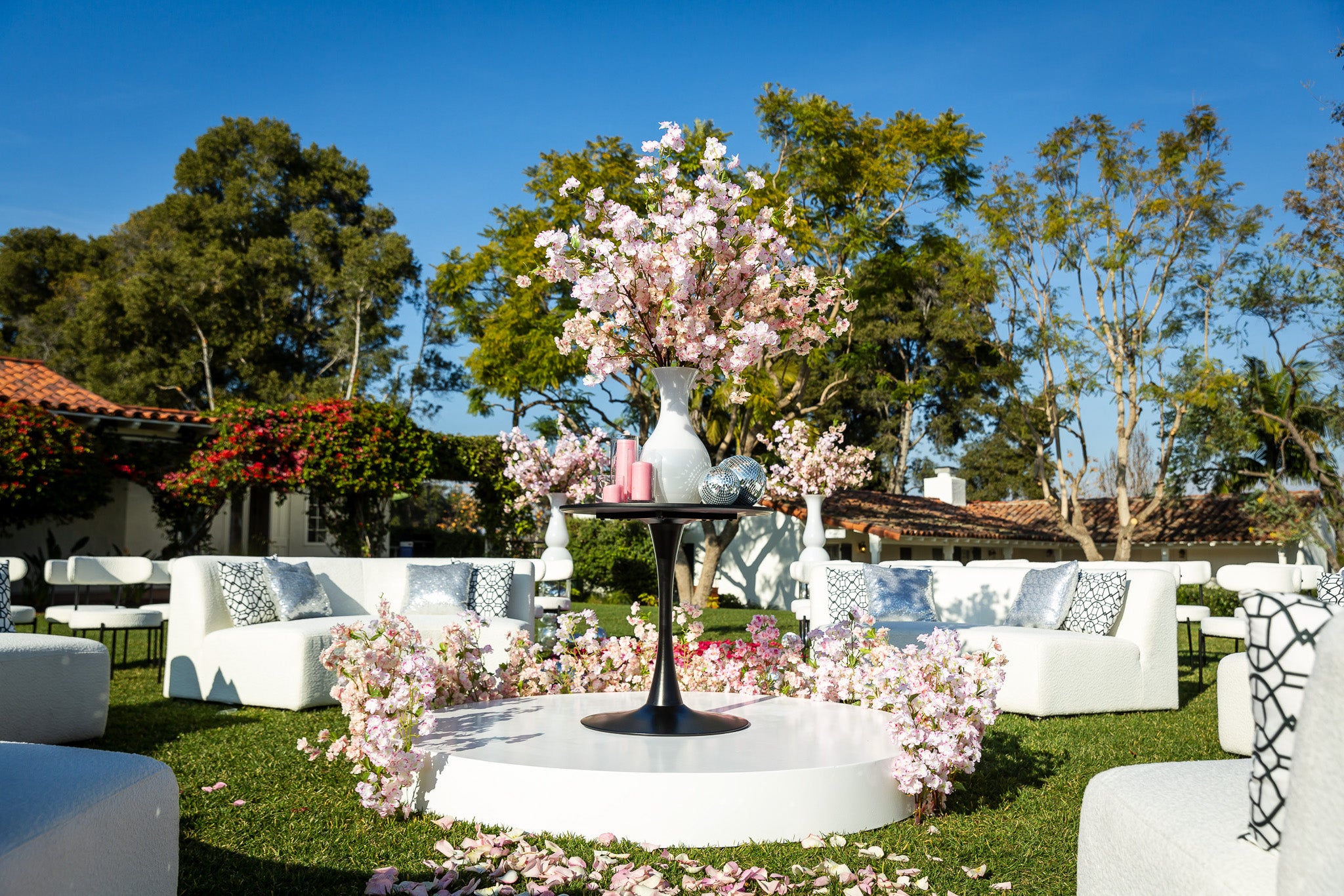 This gallery features an array of images with vibrant roses in stunning shades of pink, hot pink, red, and cream, against the sleek black furniture and shimmering gold accents. The thoughtful placement of small, delightful florals on the bar and back bar, add a touch of sweetness to this beautifully orchestrated outdoor celebration.