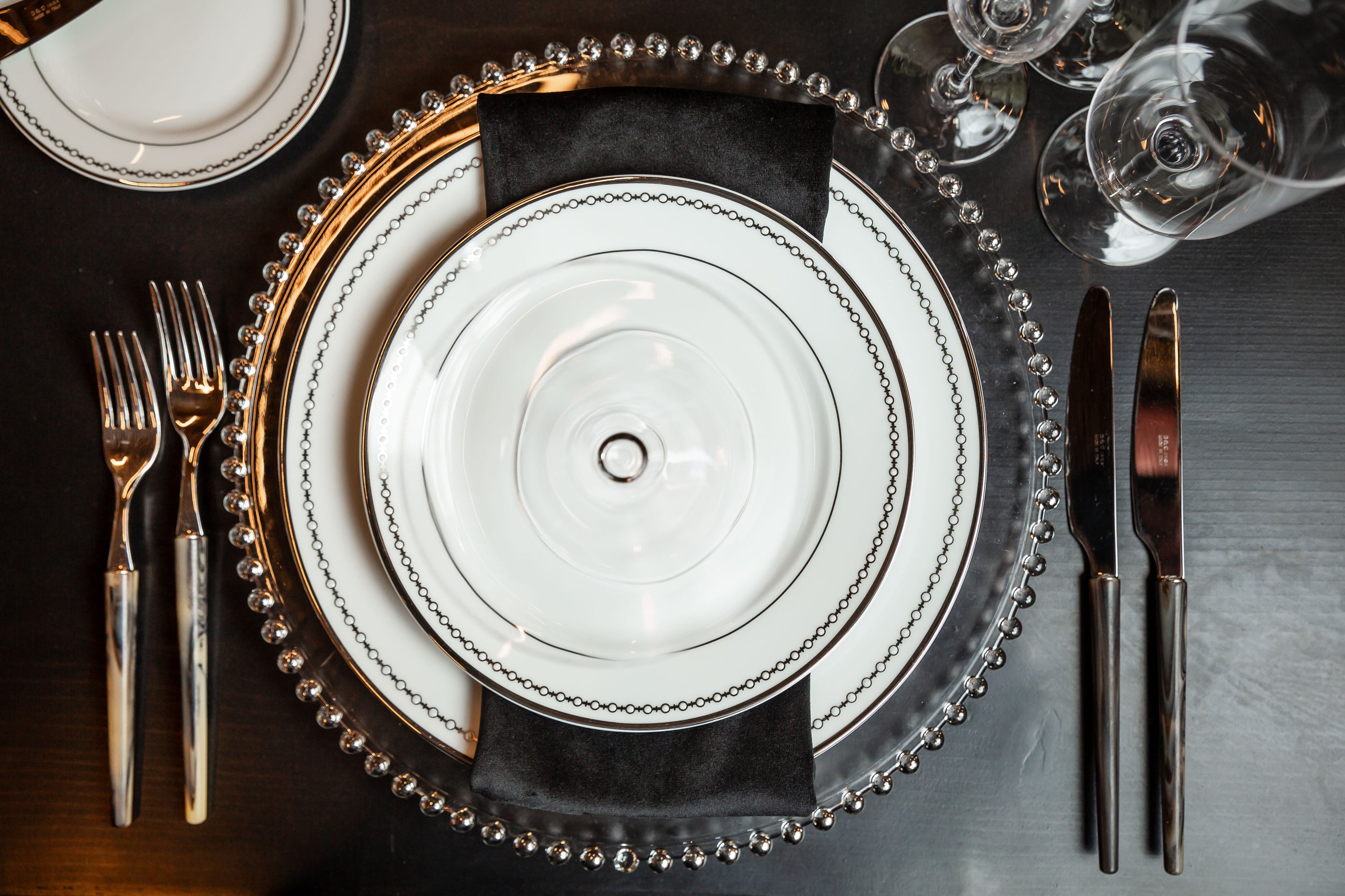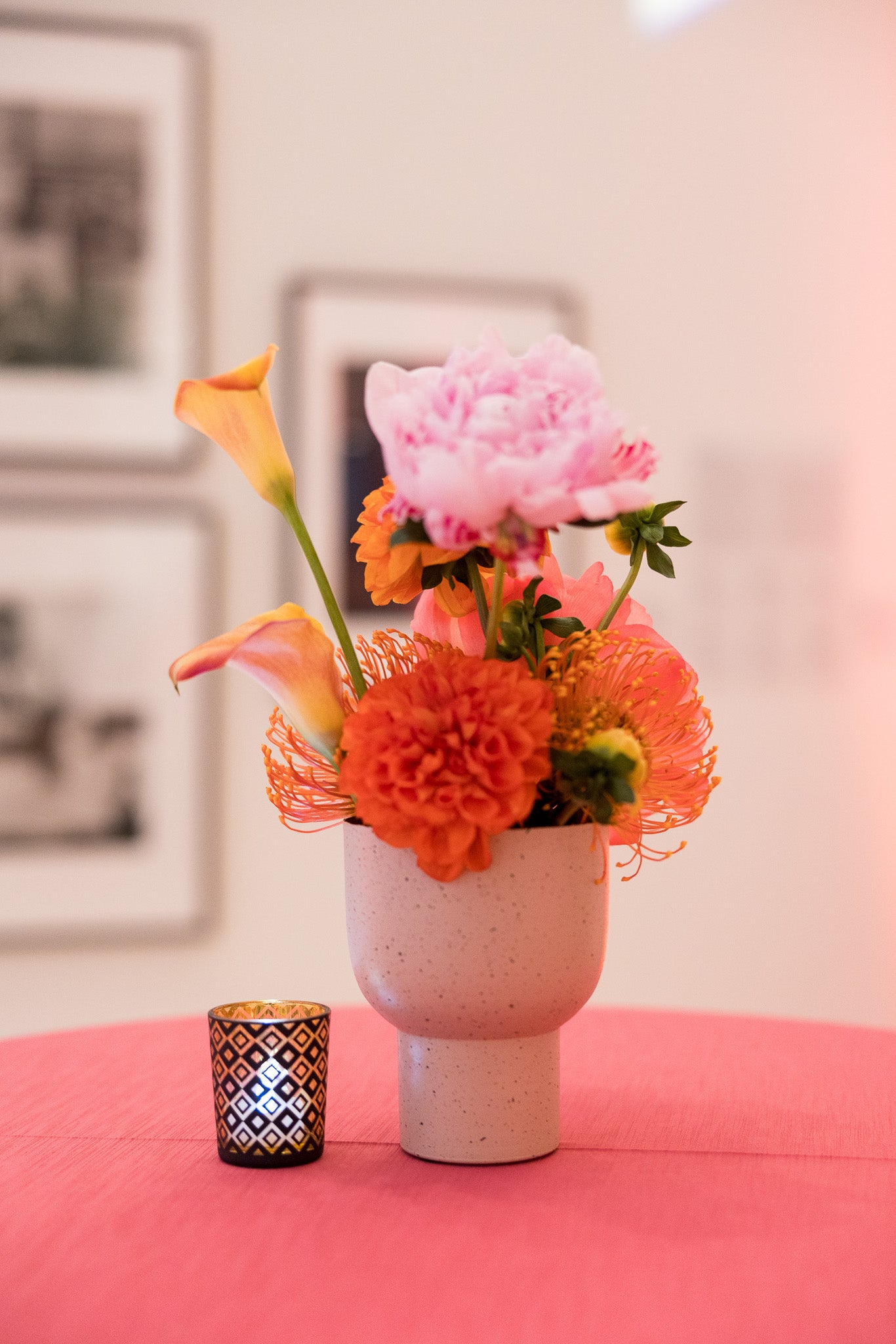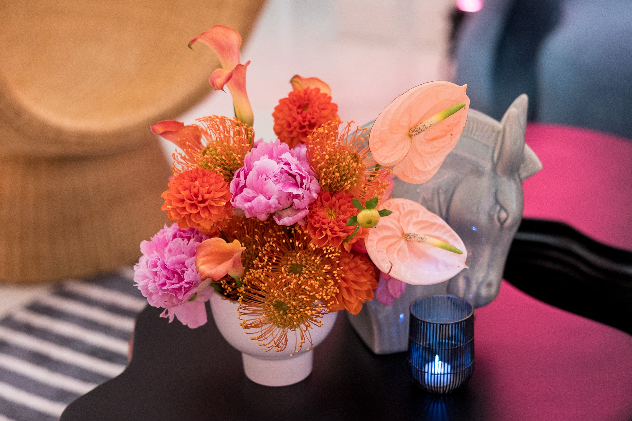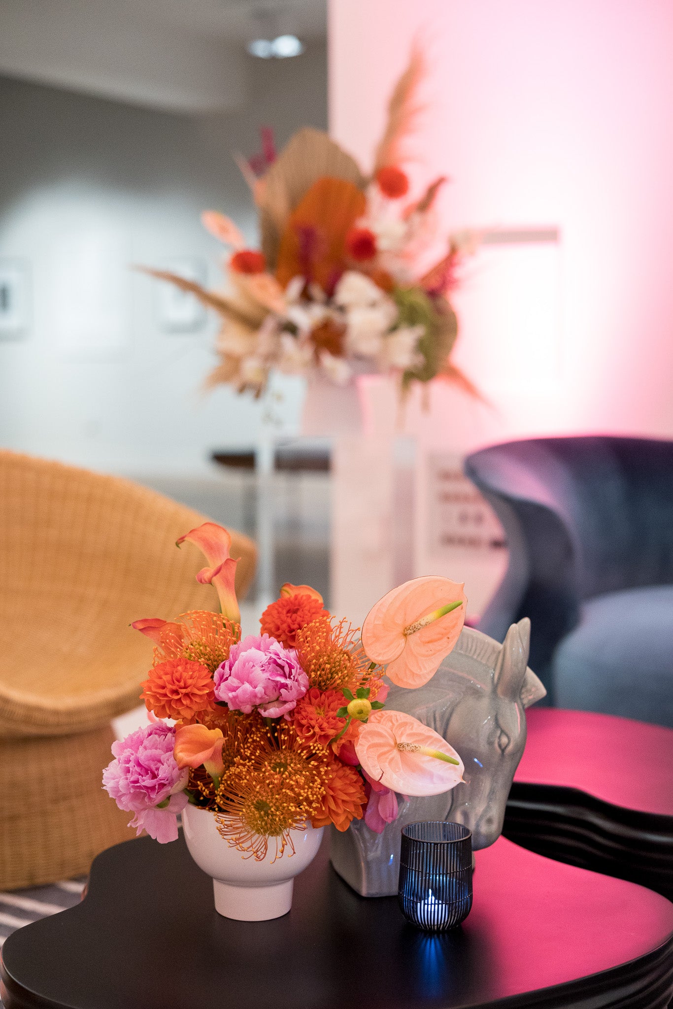 This gallery features an array of images with vibrant roses in stunning shades of pink, hot pink, red, and cream, against the sleek black furniture and shimmering gold accents. The thoughtful placement of small, delightful florals on the bar and back bar, add a touch of sweetness to this beautifully orchestrated outdoor celebration.