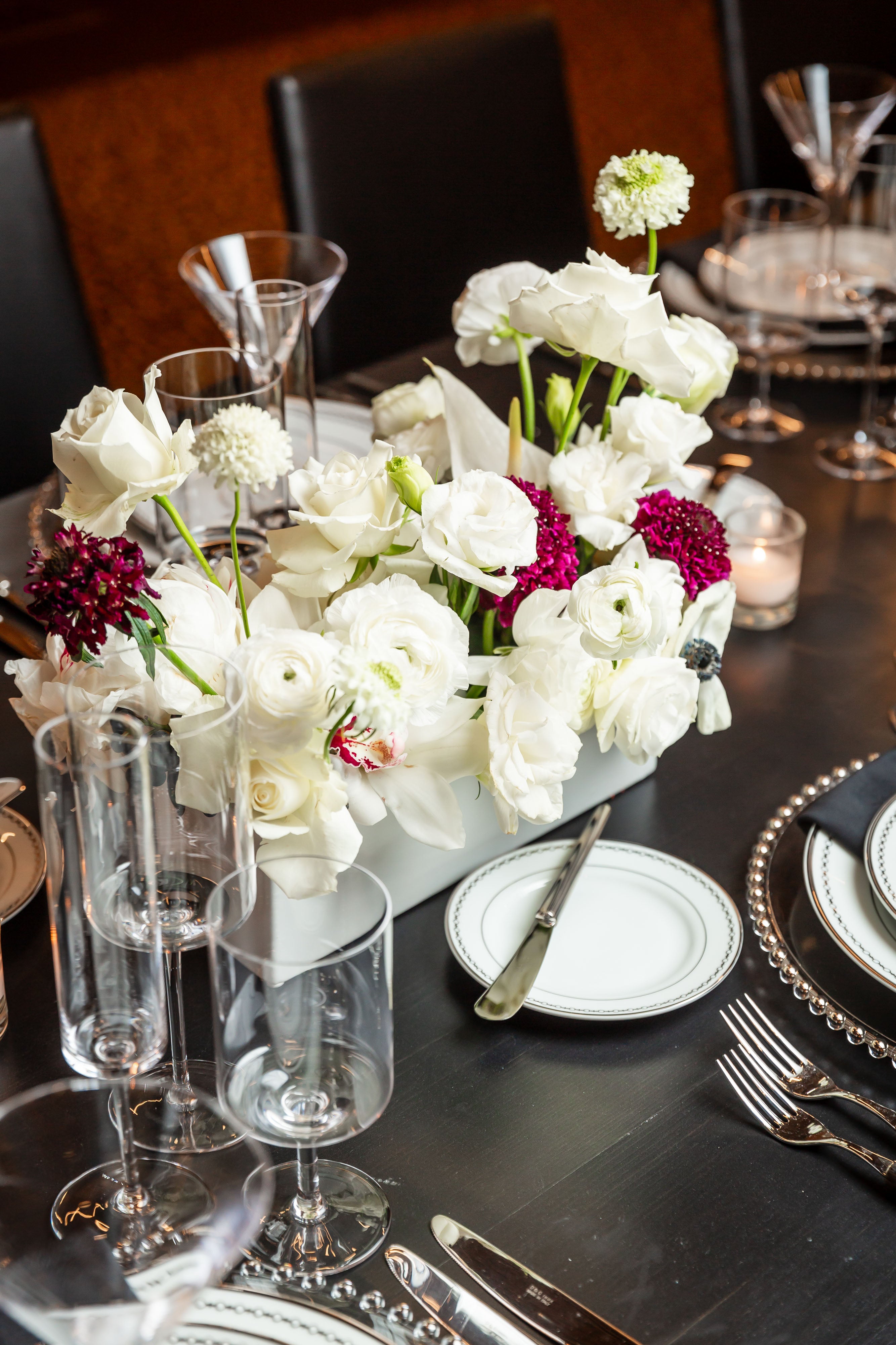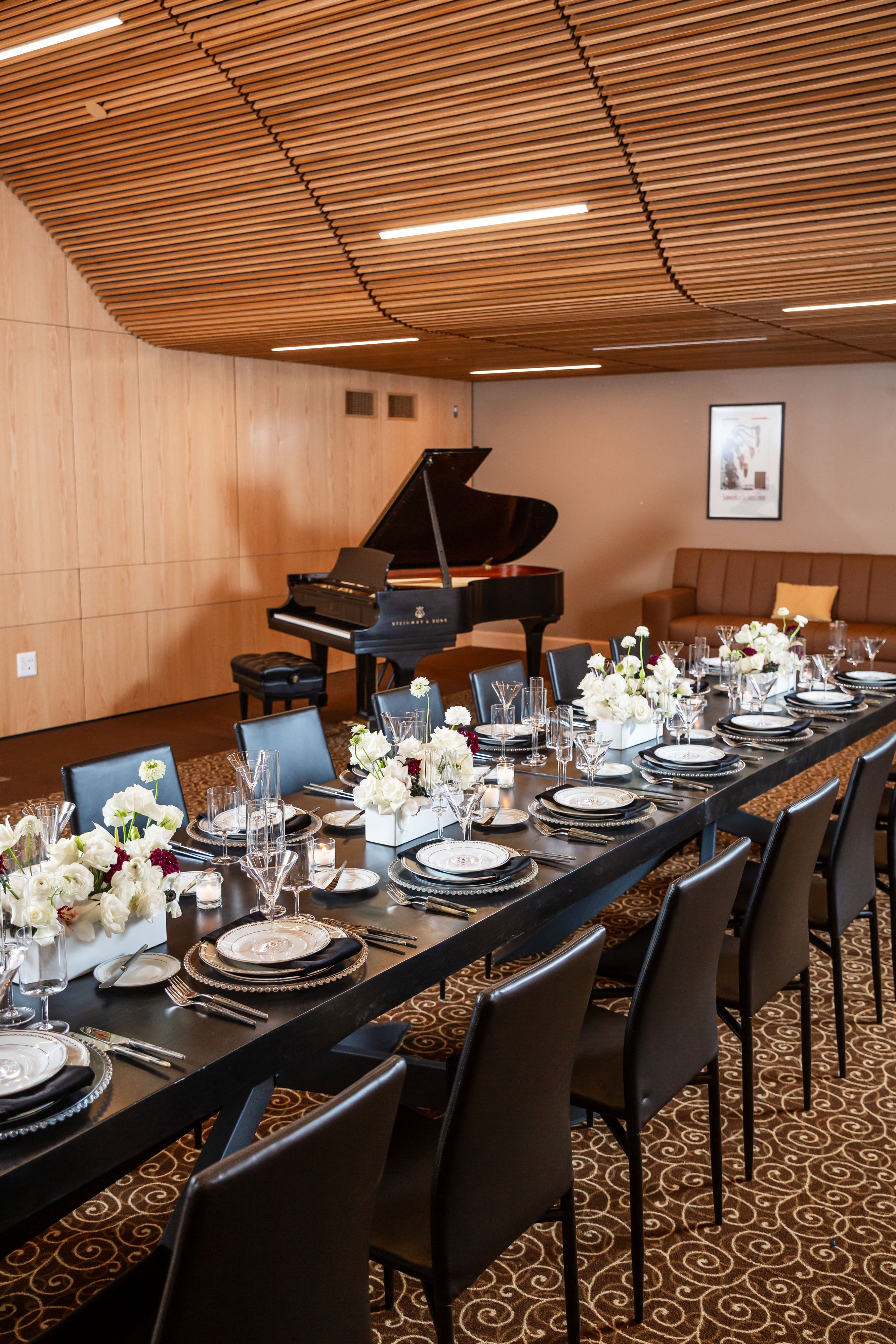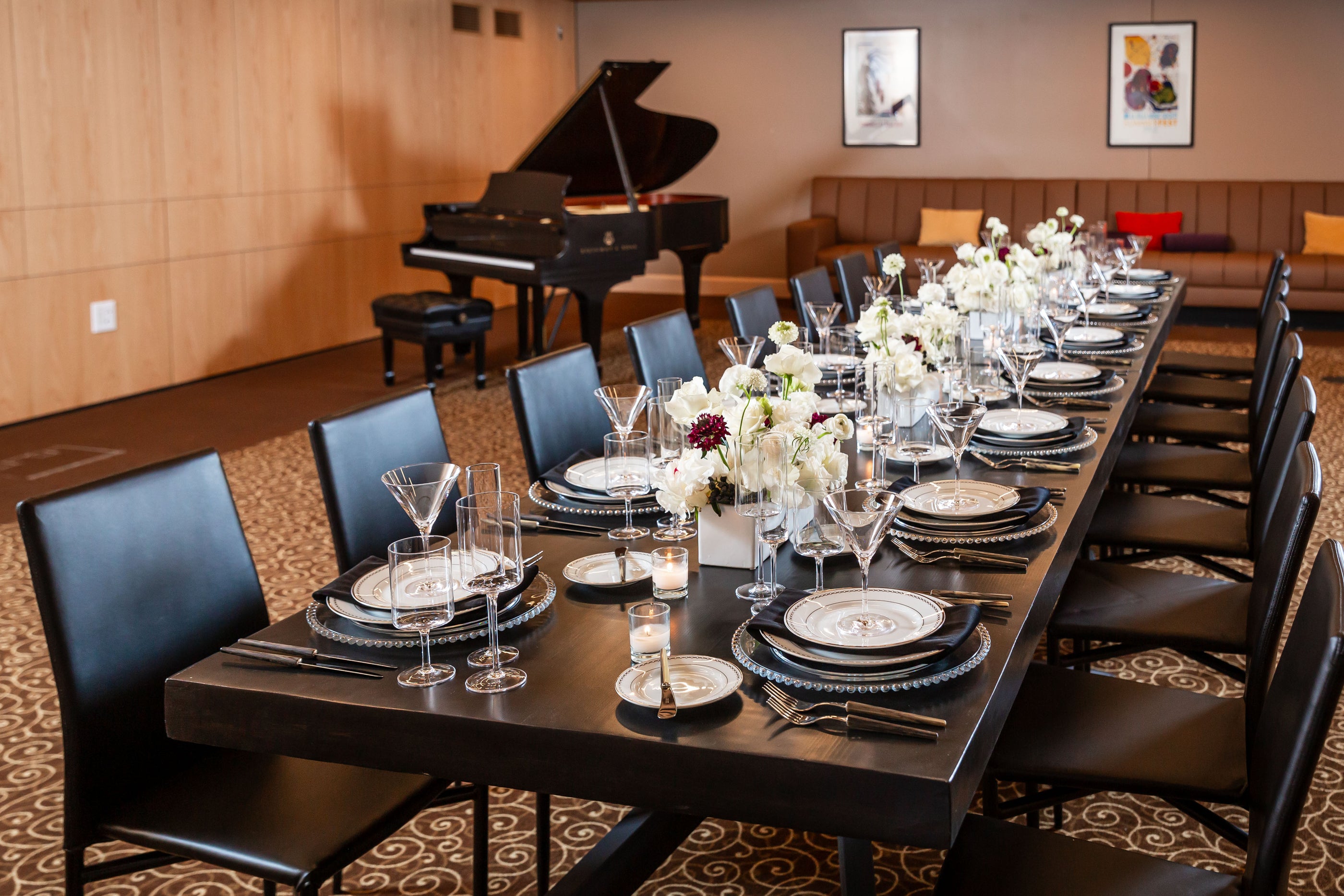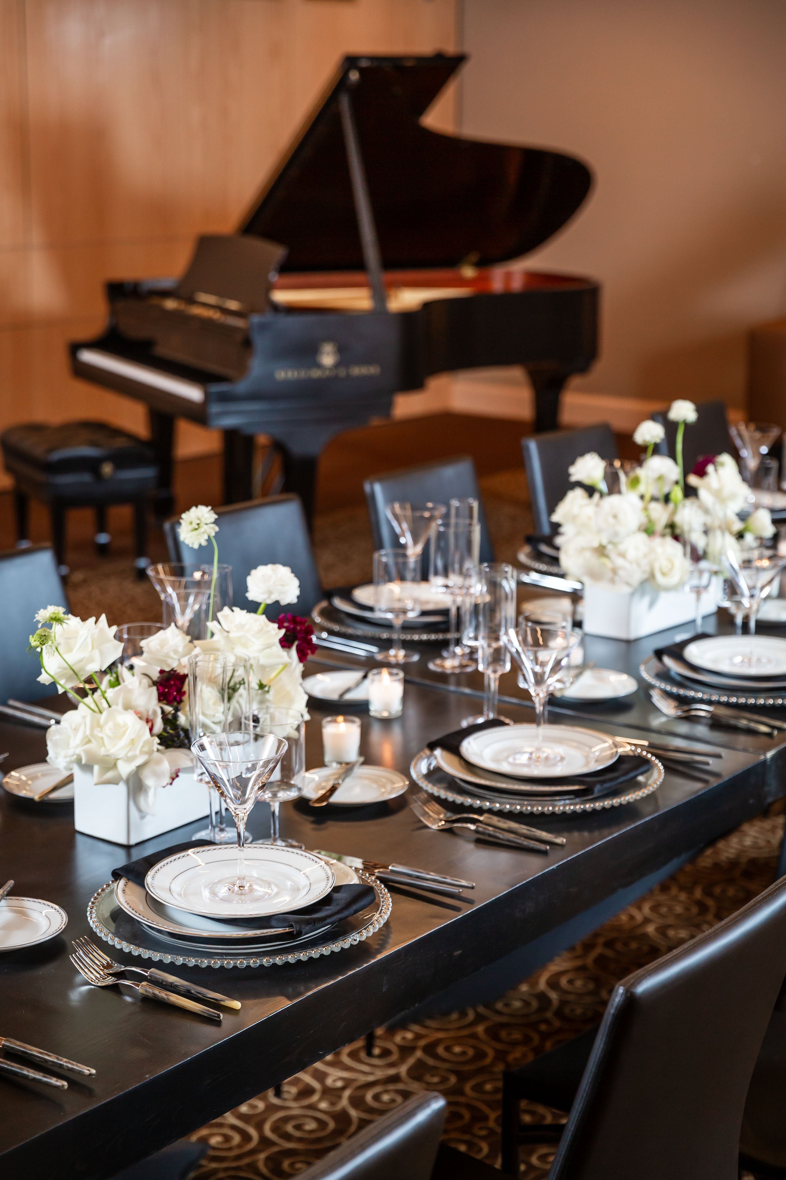 An opulent setting where sophistication and elegance take center stage. This grand room, boasting a stately grand piano, adds a touch of classic refinement. The centerpiece of this elegant dinner is a single, elongated table, exquisitely adorned with stunning florals that include pristine white roses, elegant white cymbidium orchids, and a delicate hint of white and burgundy Scabiosa. These exquisite blooms are artfully arranged in glossy white rectangular ceramic vases, creating a poetic and luxurious atmosphere.