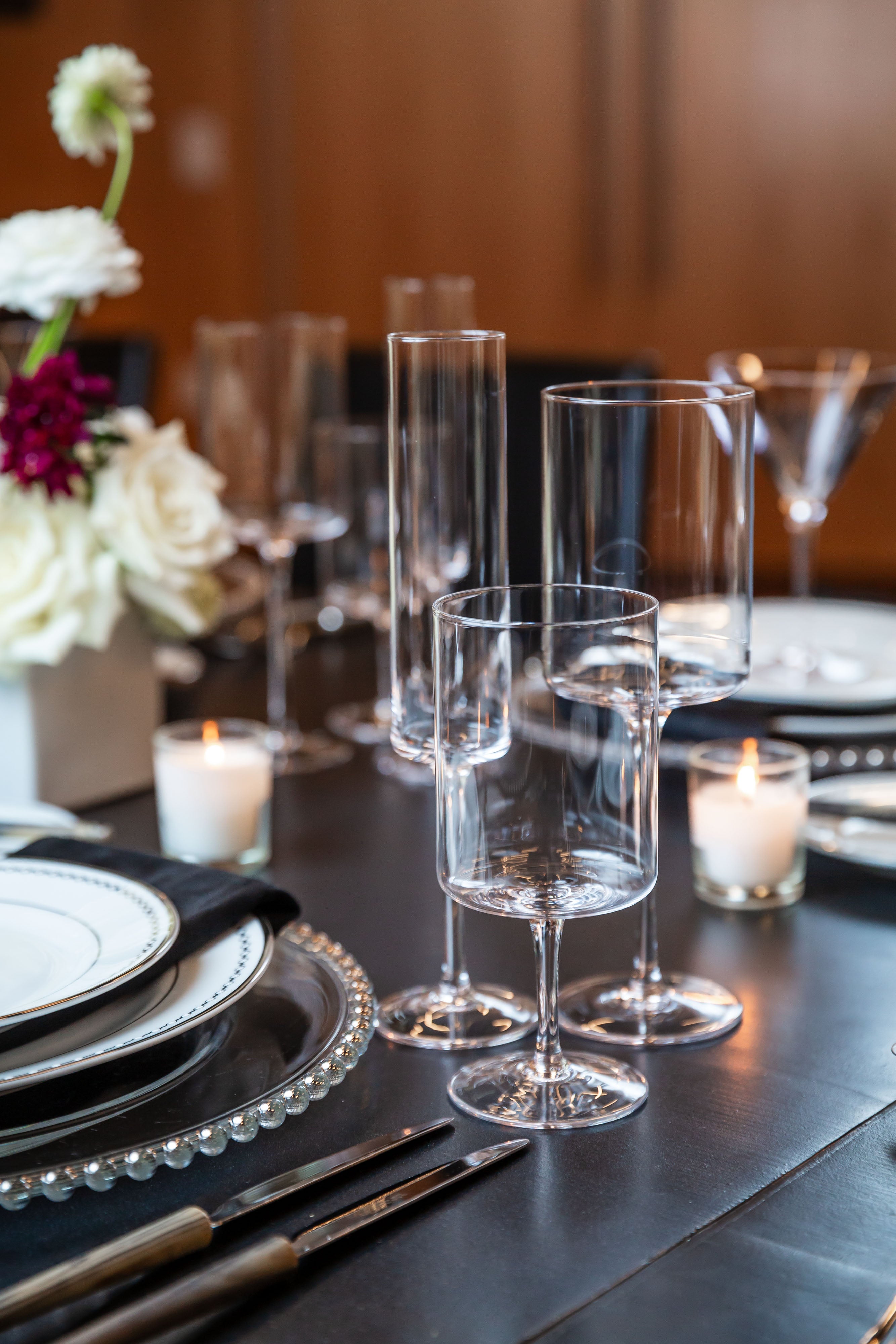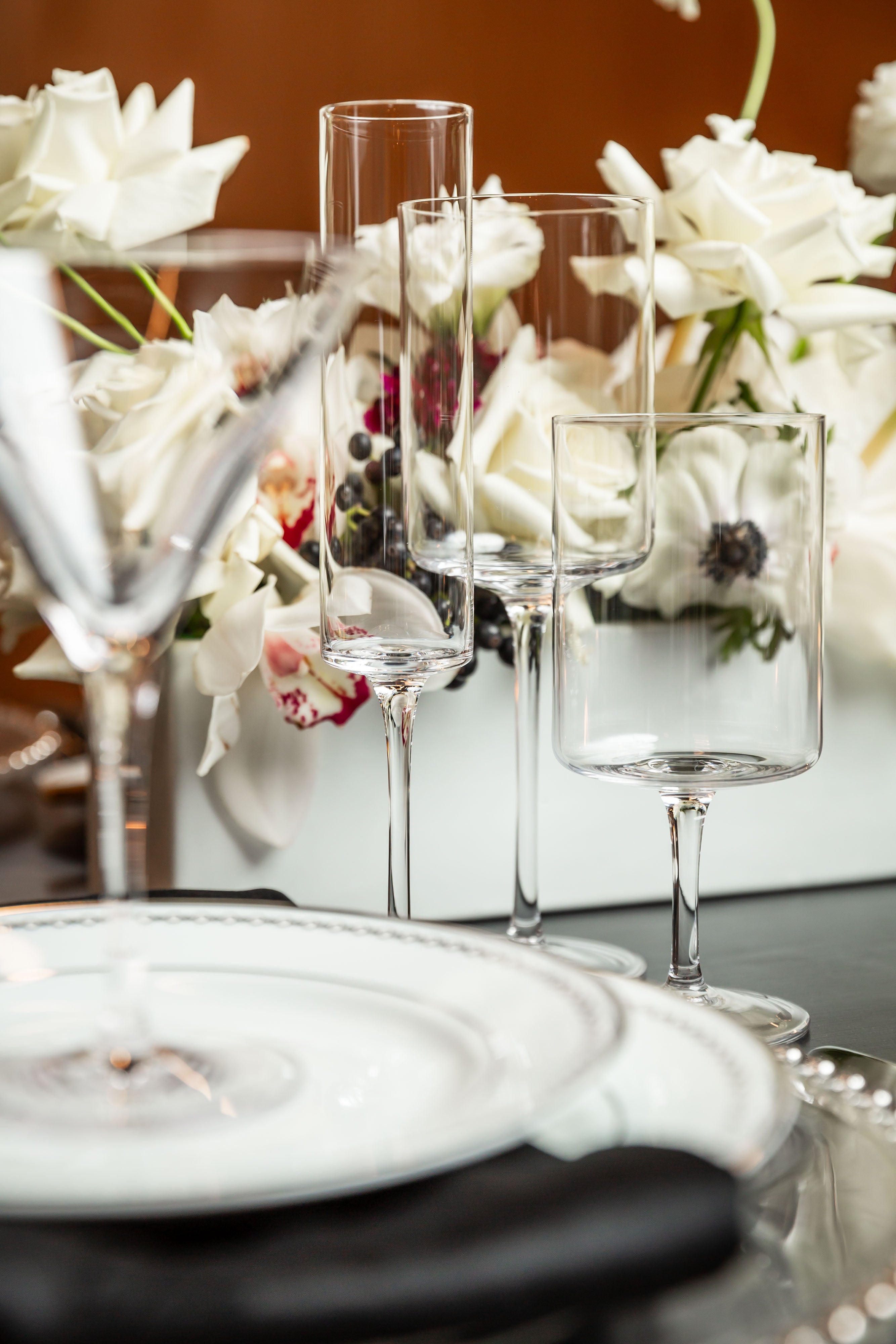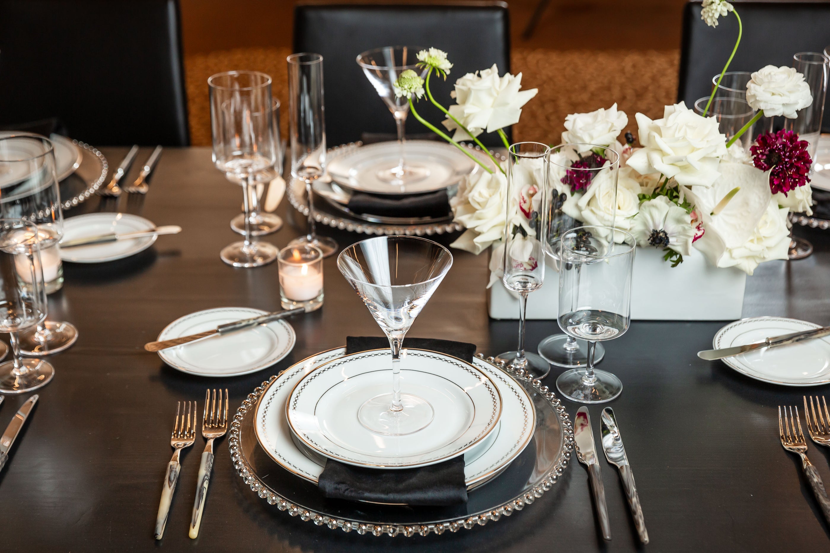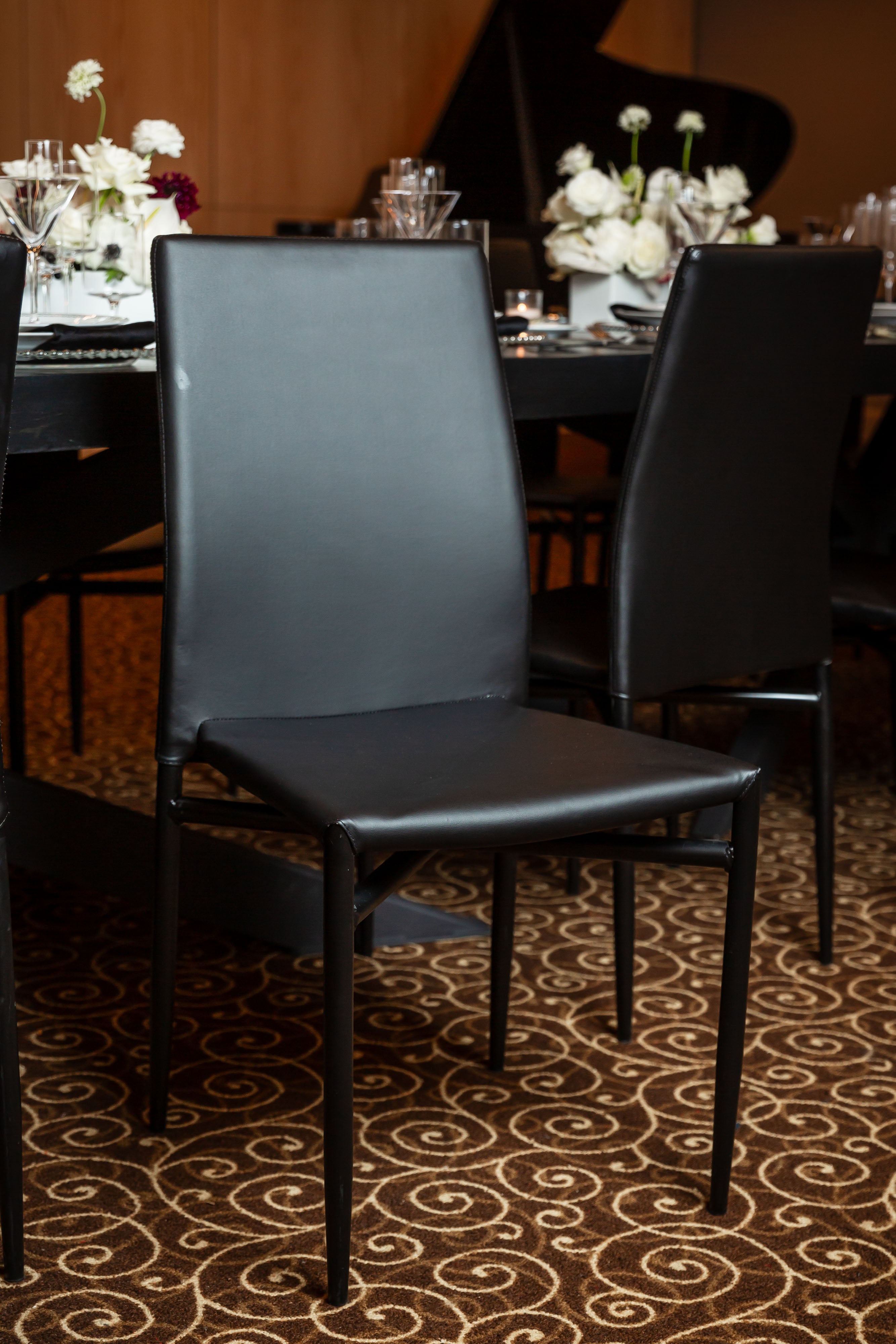 An opulent setting where sophistication and elegance take center stage. This grand room, boasting a stately grand piano, adds a touch of classic refinement. The centerpiece of this elegant dinner is a single, elongated table, exquisitely adorned with stunning florals that include pristine white roses, elegant white cymbidium orchids, and a delicate hint of white and burgundy Scabiosa. These exquisite blooms are artfully arranged in glossy white rectangular ceramic vases, creating a poetic and luxurious atmosphere.