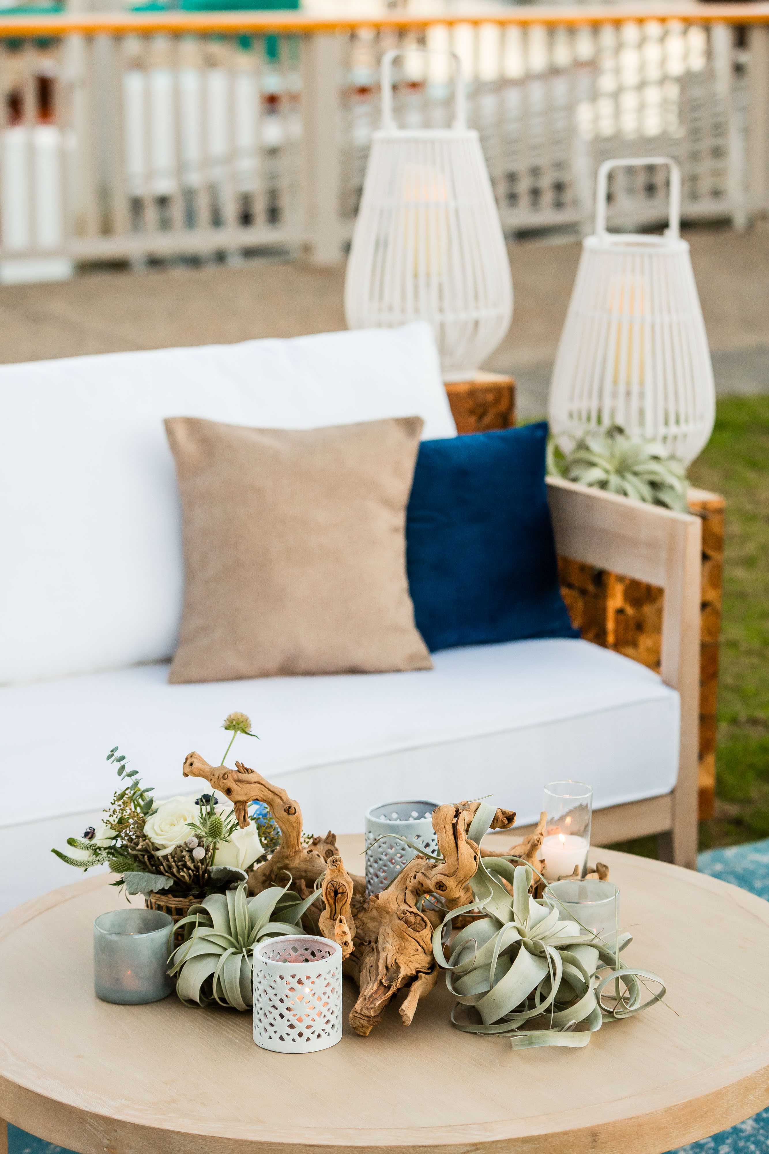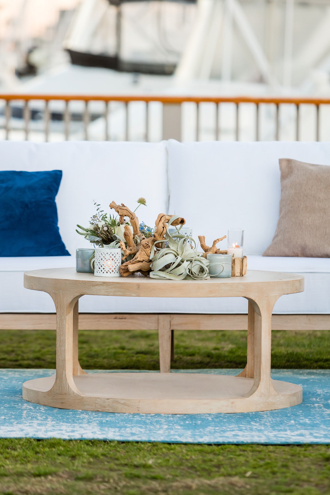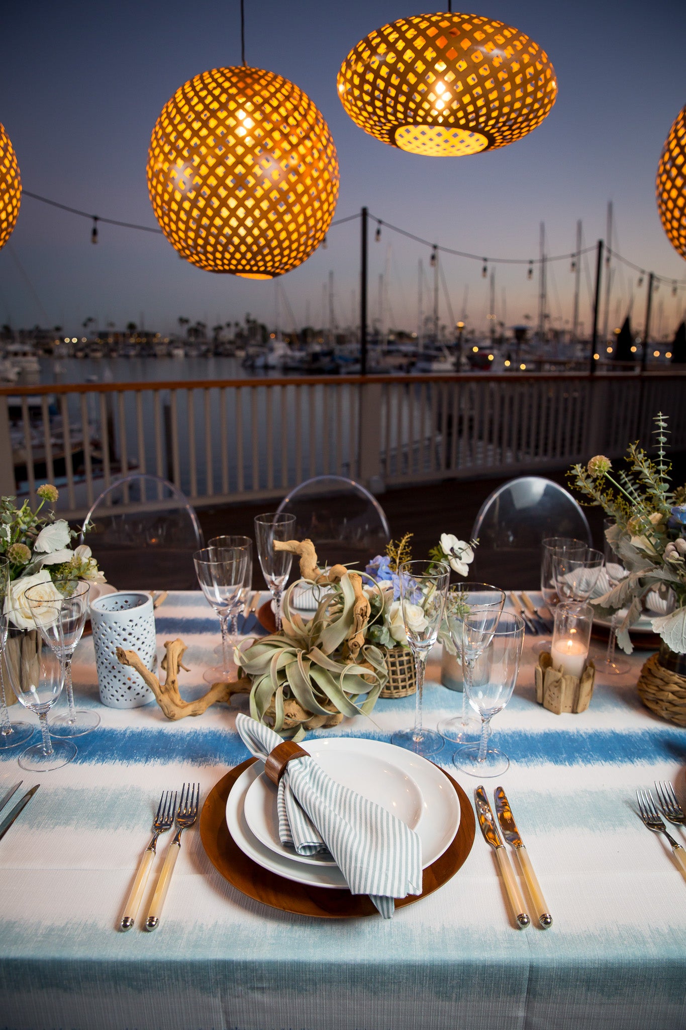 Experience the majestic beauty of a grand dining setup poised elegantly against the picturesque marina. Vibrant golden lights dance in a suspended state above the table, which is adorned in an ensemble of white and shades of blue, reflecting the nautical vibe of the marina. The table showcases a fresh, textured collection of blooms in shades of white and green, accented with elements of driftwood, rattan, and air plants, harmonizing with the maritime setting.