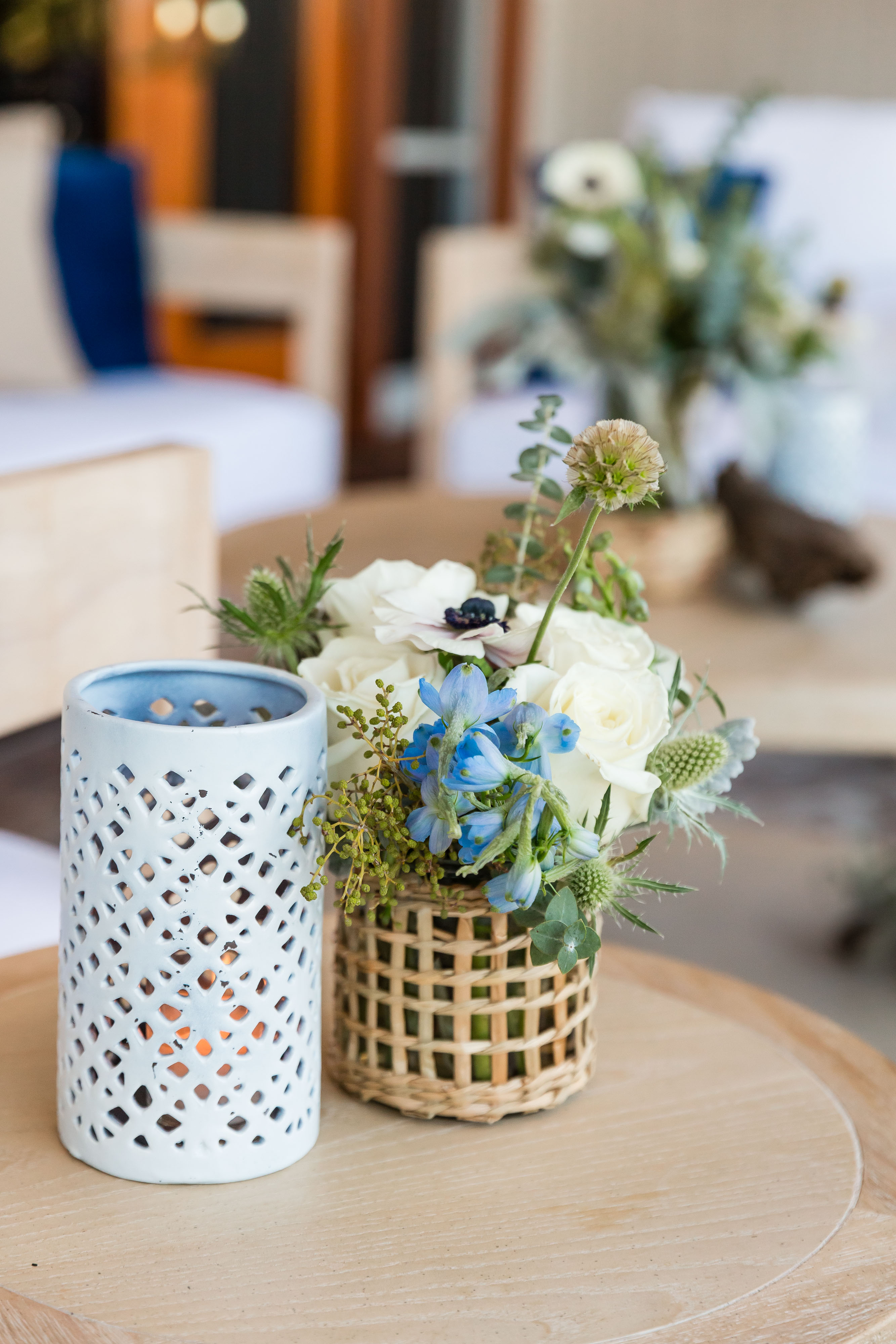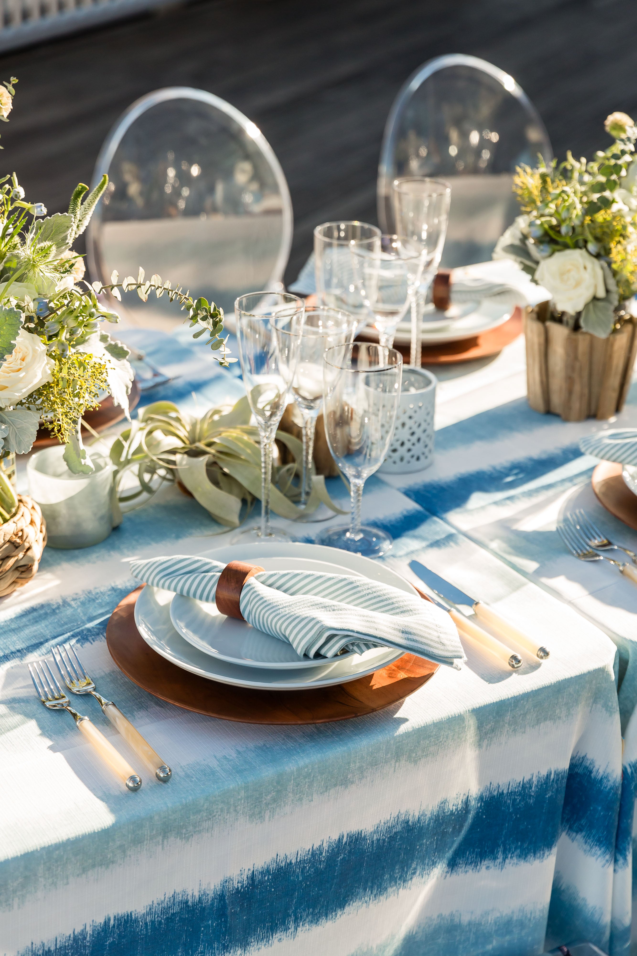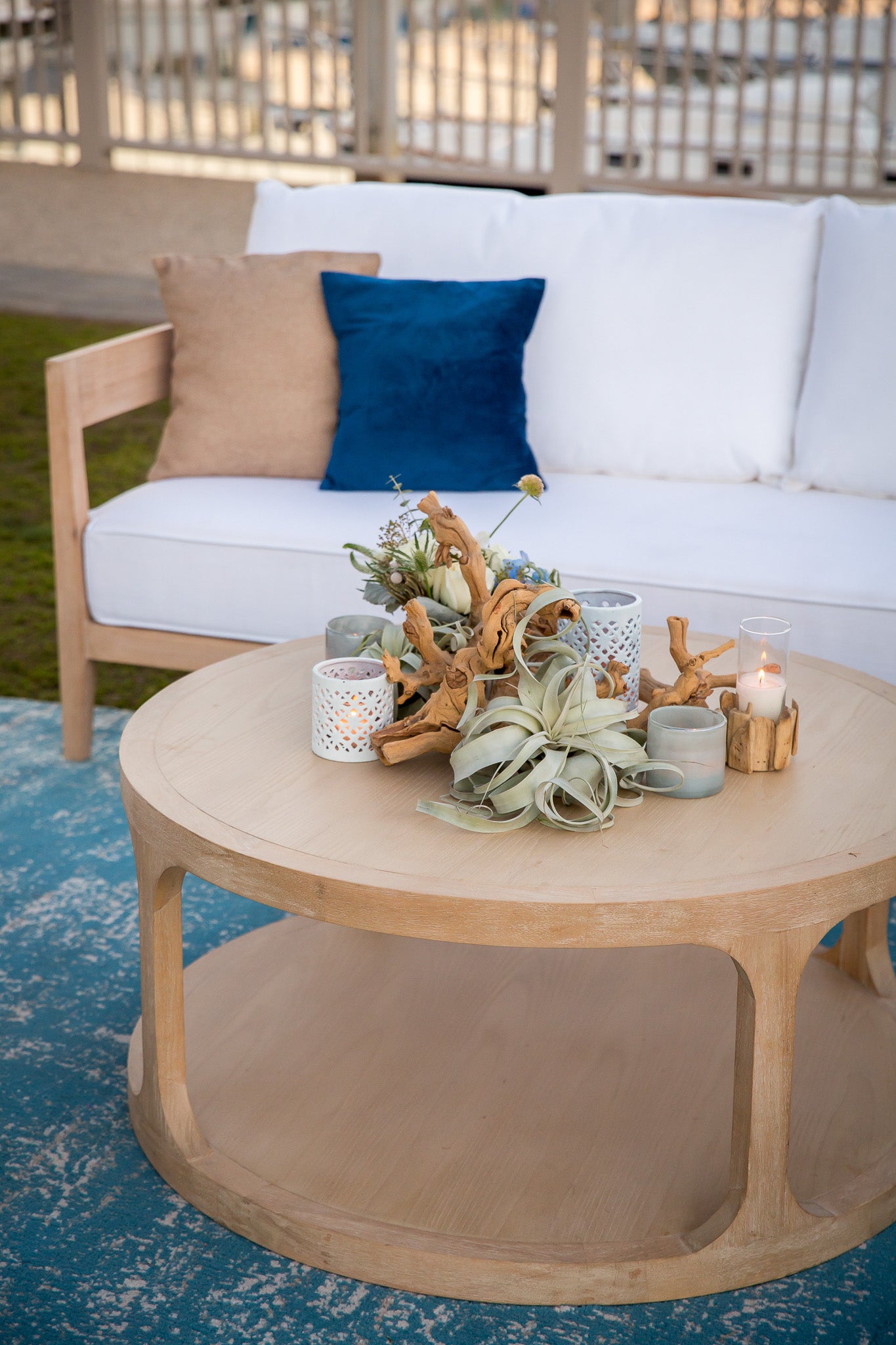 Experience the majestic beauty of a grand dining setup poised elegantly against the picturesque marina. Vibrant golden lights dance in a suspended state above the table, which is adorned in an ensemble of white and shades of blue, reflecting the nautical vibe of the marina. The table showcases a fresh, textured collection of blooms in shades of white and green, accented with elements of driftwood, rattan, and air plants, harmonizing with the maritime setting.