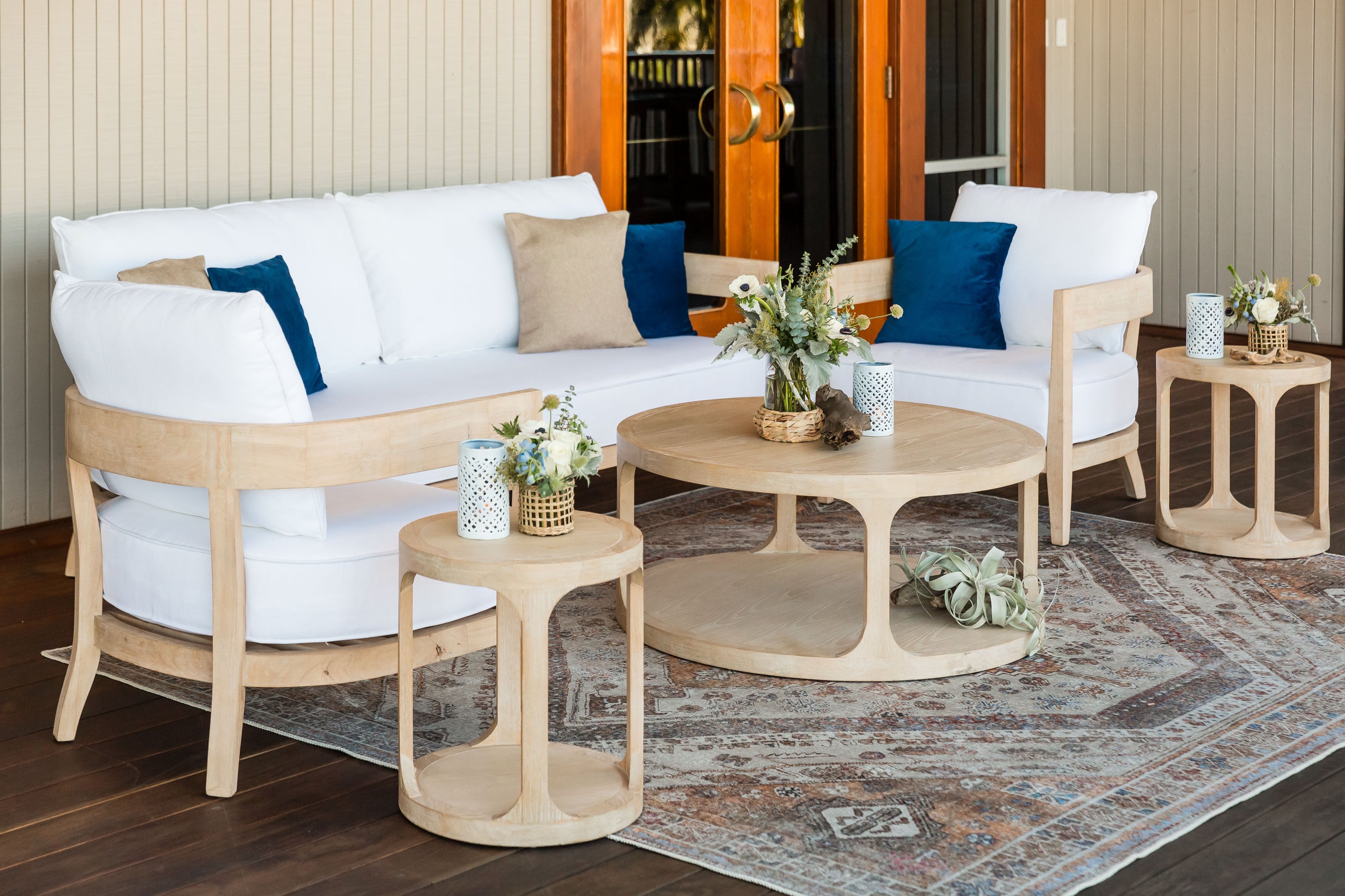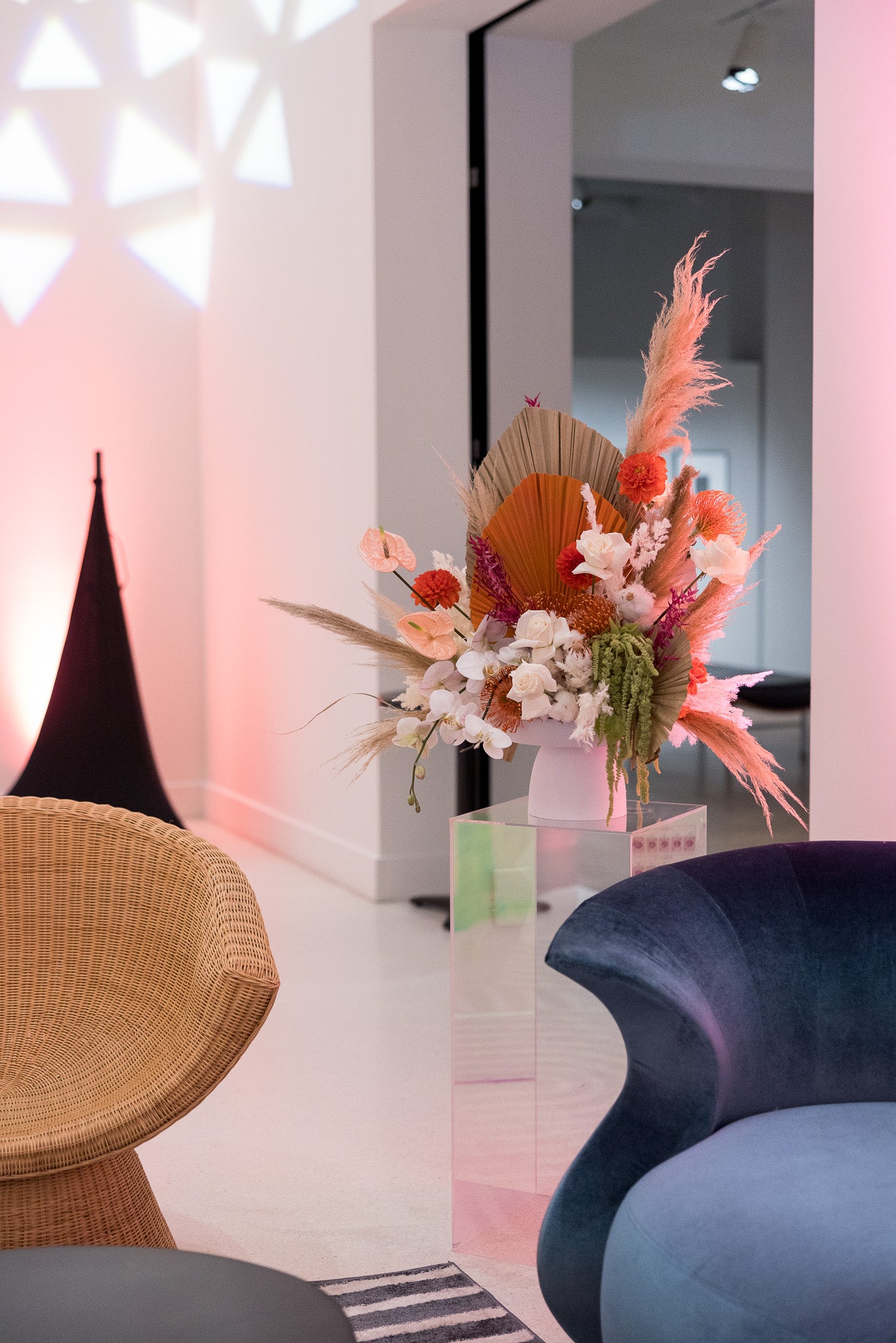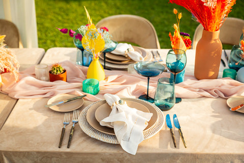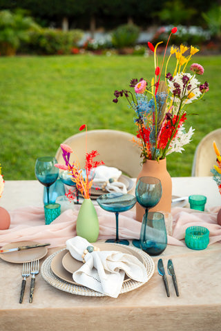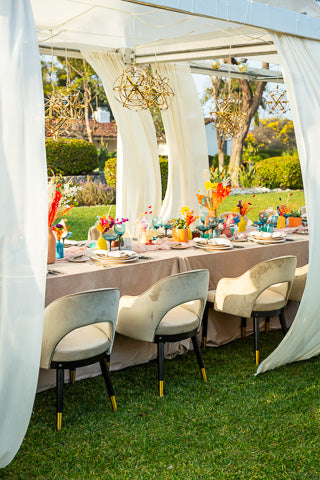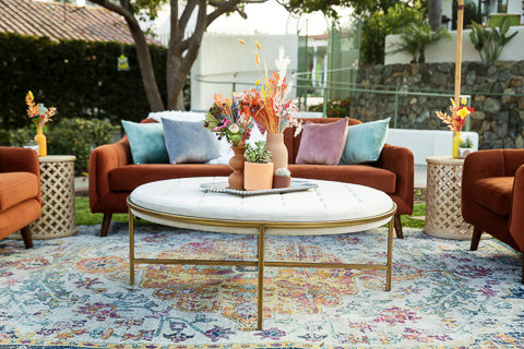 A backyard is transformed into a tranquil, bohemian retreat, a haven of relaxed comfort and vivid expression. The seating area is a harmonious blend of understated colors - soft purples, blues, and more - contrasting beautifully against the rich, rust-colored furniture. Scattered across side tables and centered within a tented dining space are eclectic groupings of vases, varying in size, shape, and color, each brimming with dried flowers in jewel tones, adding a burst of bohemian charm and color.