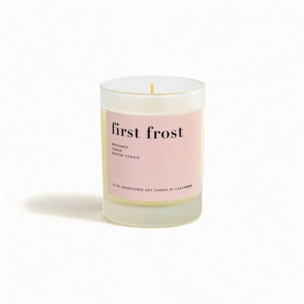 First Frost: A crisp and invigorating blend of Bergamot, Lemon, and Winter Florals reminiscent of the first magical frost of the season.