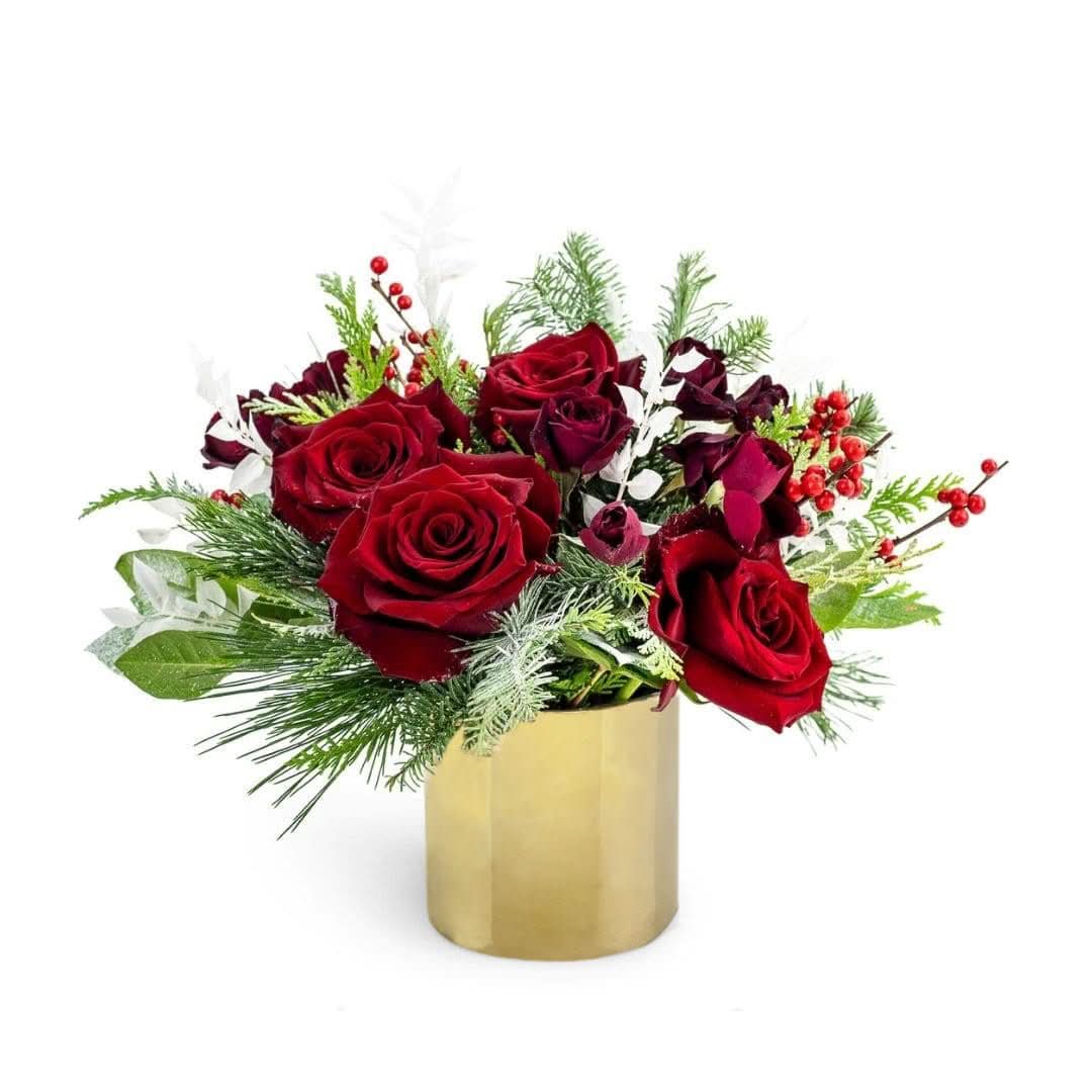 Presenting the First Frost Floral, a dazzling celebration of the season’s first chill, elegantly arranged to capture the magic of winter. A gleaming 4” gold ceramic vase cradles a lush arrangement of rich red roses, vibrant ilex berries, and deep burgundy spray roses, exuding warmth and festivity. Snow-tipped evergreen branches and bleached leaves add an enchanting frosted effect, while mixed evergreens provide a delightful contrast of textures and hues.