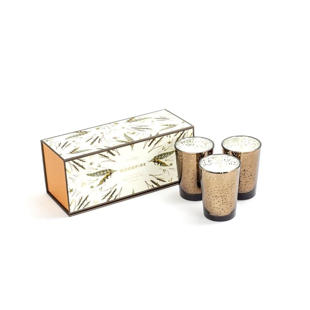 Capture the spirit of the season with the Woodfire Nobel Holiday Gift Set. These three votive candles with an aroma of cedarwood and smoke accords blended with heady patchouli leaves and vanilla to inspire the coziness of a warm winter's fire.